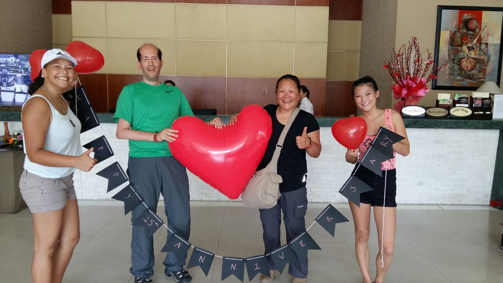 Om te beginnen maandag. We begonnen op een nieuwe afdeling, de 'Surgical department'. Er blijken meerdere chirurgische afdelingen te zijn en maandag begonnen we op de 'Digestive' (Maag, darm, lever) afdeling. Dit keer waren we echt met z'n tweetjes, zonder de Finse studenten. Het was interessant om de afdeling te zien. Het was ook weer heel warm, waardoor Saar zich na een tijdje niet zo goed voelde, daarom mochten we wat eerder van de afdeling weg. Dit kwam eigenlijk wel goed uit, want de ouders van Saar arriveerden maandag ook in Huế. We konden rustig aan doen en hoefden niet zo te haasten. We haalden de taart op (die we hadden besteld bij het Franse bakkerijtje) en namen onze slingers en ballonnen mee naar het hotel waar haar ouders aan zouden komen. Het plan was namelijk om de kamer van haar ouders te versieren, omdat ze 25 jaar getrouwd waren. Helaas mochten we niet op de kamer, maar mochten we in de lobby alles klaarmaken, zodat de hotelmedewerkers het voor ons konden doen. Net toen we druk bezig waren, kwamen ze er al aan met de taxi. Niet zoals gepland, maar alsnog een leuke entree 😊. Na het welkom en even gesetteld te hebben op de kamer, gingen we de ouders van Saar gelijk het Family restaurant laten zien. Daar hebben we lekker gegeten. Daarna was het even uitrust tijd en 's avonds was het plan om naar het restaurant op het water te gaan. Prompt begon het in de avond te regenen en onweren, waardoor dat niet door kon gaan, omdat je buiten zit bij dat restaurant. Als alternatief gingen we naar het hotel, waar we laatst ook met de Finnen zijn geweest, waar we heel lekker hebben gegeten. Na het eten, toen er een taxi voor ons was gebeld, die net aan kwam rijden, werden we nog uitgenodigd door de hoteleigenaar om een drankje te komen doen... "Leave the taxi, it's OK, he will wait'' .. Oké dan maar. Nou bedankt meneer de eigenaar voor de gratis Port en sterke drank #blechh !